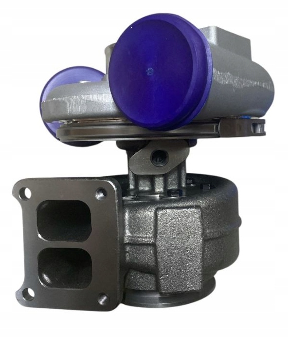 Oferowana turbosprężarka ma zwartą, wytrzymałą konstrukcję – okrągły korpus odlewany z metalu cechuje się srebrzystym połyskiem i wzmocnieniami żebrowymi, co jasno wskazuje na przygotowanie do pracy przy dużych obciążeniach. Na króćcach wlotowych i wylotowych fabrycznie osadzono fioletowe, plastikowe zatyczki, które chronią newralgiczne strefy przed pyłem i uszkodzeniami podczas magazynowania oraz transportu. Estetyka wyrobu jest podporządkowana funkcji, a jednocześnie spójna z przemysłowym charakterem współczesnych układów napędowych – prostokątna, czterootworowa flansza ułatwia dokładne dopasowanie do kolektora, a wyrazista geometria korpusu sprzyja bezproblemowemu montażowi i integracji z nowoczesnymi silnikami Deutz. Brak śladów eksploatacji czy ubytków materiału potwierdza fabryczną nowość oraz dbałość o detale na każdym etapie wytwarzania.